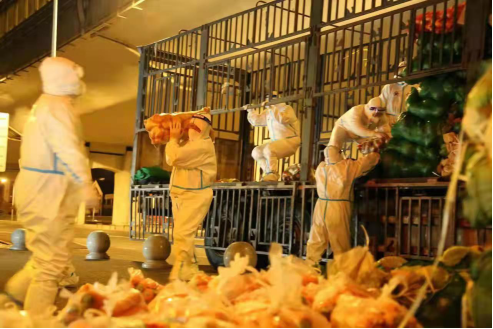 他们身穿白色防护服,将一箱箱、一袋袋沉重的蔬菜扛在肩上,抱在胸前,车上车下一趟又一趟,汗水湿透了他们的衣服,但他们一刻也没有停歇。搬卸工作持续4个多小时,大家累得瘫在地上……