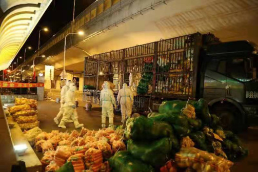 4月1日夜里11点,校园门口一片忙碌,打破了多日来校园的静谧。朝阳区教育局捐赠的1万多斤蔬菜及时抵达,安全处的5名同志和后勤处的3名同志第一时间赶赴现场,进行蔬菜的消杀和搬卸工作。