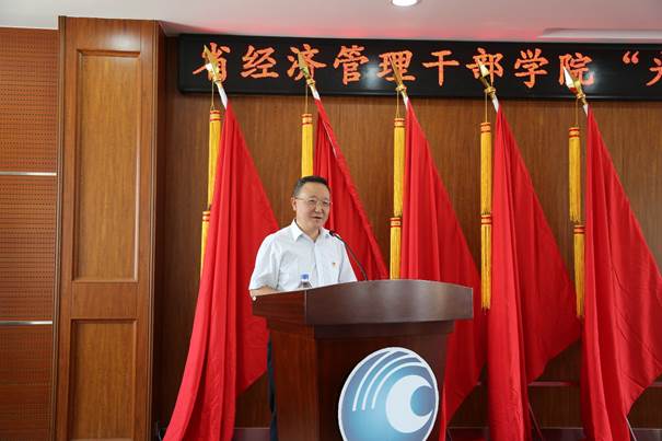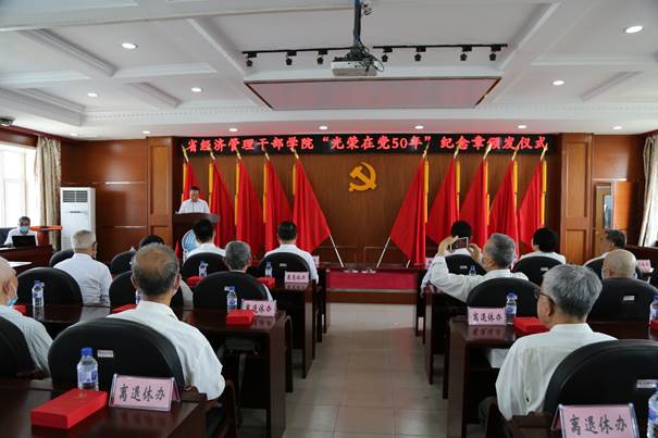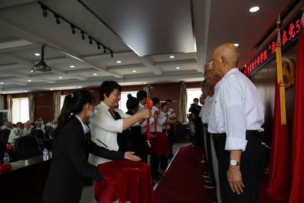 颁发仪式在庄严的国歌声中拉开序幕,党委书记崔永胜代表学院党委致贺词。他首先向学院获颁纪念章的58名老党员表示衷心的祝贺并致以崇高的敬意!他指出,在建党100周年之际,党中央决定在全党颁发“光荣在党50年”纪念章,充分体现了以习近平同志为核心的党中央对广大老党员的关心关怀,对于增强党员的荣誉感、归属感、使命感,具有十分重要的意义。他指出,学院离退休的老党员,践行初心使命,永葆政治本色,为学院的昨天挥洒青春和热血,谱写了壮美的诗篇;如今虽然身离岗位,但却心系学院,学院的建设成就,凝聚着老同志的开拓和奉献,饱含着老同志的创造和积累,浸透着老同志的心血和汗水。他要求各级党组织和相关部门,要继续抓好关心关爱老党员工作,做到政治上尊重、生活上关心、精神上激励,用心用情用力解决老党员所急所需所盼,真正让老党员们感受组织温暖、享受幸福生活。他号召全院广大党员和干部要向老党员同志们学习,团结一致、攻坚克难,在学院转型发展关键时期,以奋发进取的精神状态,积极应对新形势、新挑战,敢于担当责任、勇于直面困难,创造性开展工作,努力开创学院事业发展的新局面,以优异成绩庆祝建党100周年!