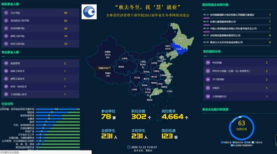 本次网络双选会经过前期的认真筹备和广泛宣传,吸引了来自全国8个省市的78家知名企事业单位参会,其中省内企业53家,省外企业25家;涉及国有企业6家,民营企业65家,三资企业2家,社会团体非营利组织1家等;涵盖信息技术、制造、批发零售、金融、文化体育娱乐、教育、房地产、建筑、公共管理、卫生与社会工作、交通运输等行业;提供职位302个,用人岗位4664个。此次双选会共吸引我院231名毕业生参会,学生投递简历123份。