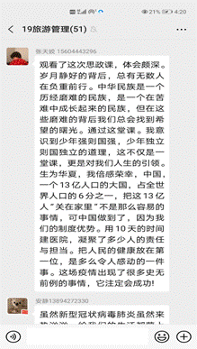 文化旅游学院学生王娜说:“在此次战疫中无处不显示着中国的强大,无处不显示着中华民族的英雄气概,更无处不显示着中国人民的团结,我庆幸我是中国人,我骄傲我是中国人!”