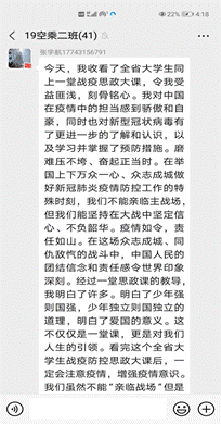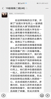 机电工程学院学生陈宇晗:“这堂战疫思政大课令我们深受触动,更加深刻的感受到祖国的强大!在这堂课上,我深刻体会到了一线医务工作者的艰难和风险,他们站在抗疫一线,用行动向我们诠释什么是大爱无疆。疫情虽然隔离了我们彼此之间的距离,但是全国人民的心始终在一起。目前,这场疫情防控阻击战形势仍然严峻,按照这堂课中所说的,不随便出门,戴口罩,不信谣,不传谣,勤洗手,讲卫生,为这个社会,贡献出自己的力量。中国加油!”