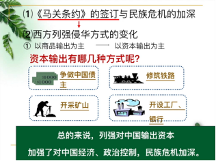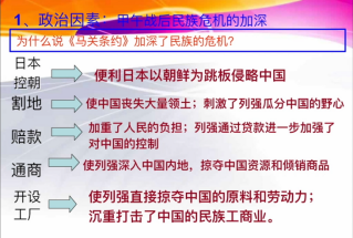 戊戌变法背景展开:时代背景;清政府统治危机加剧;19世纪末民族资本主义初步发展,资产阶级维新派登上历史舞台;资产阶级早期维新思想形成。测验答题并讲解归纳要点:列强侵华方式变化;强占租借地划分势力范围;美国“门户开放”政策;清政府危机出现原因(政治、经济、结果);民族工业发展状况、特点、原因;早期维新思想。参与测验答题,知识要点较清晰,学生容易找到。了解学生知识点掌握、上课在线情况。根据学生回答。酌情加分。