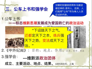 公车上书后,康有为又三次上书光绪帝,指出形势危急,惟一途径就是变法。但顽固派大臣竭力阻挠,康有为与顽固派大臣进行了论战。测验答题并讲解, 知识要点较清晰,学生容易找到。了解学生知识点掌握、上课在线情况。