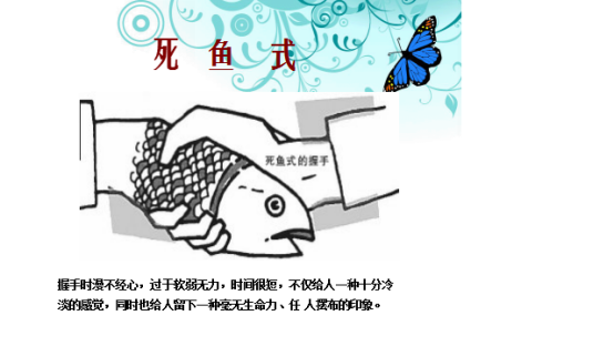 (5)死鱼式:握手时漫不经心,过于软弱无力,时间很短,不仅给人一种十分冷淡的感觉,同时也给人留下一种毫无生命力、任人摆布的印象。