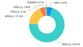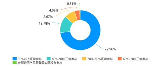 通过问卷调查分析,72.96%的教师反映在授课过程中90%以上的学生都等正常参与网络学习,13.78%的教师反映在课堂上80%-90%的学生可正常参与,但也有个别教师认为学生参与程度低,只是登录没有实际参与;针对学习任务的完成情况统计,70%的教师反映学生任务完成率可达90%以上,17.3%的教师反映学生任务完成率在80%-90%之间,另有10%左右的教师反映学生任务完成率较低。