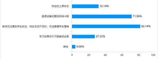 调查影响教学效果的因素结果显示,大多数教师认为主要因素在于教师无法看到学生状态,师生交流不及时,无法掌握学生情绪,以及设备上的卡顿造成教学效果不理想。通过以上调查,希望各分院(部)及任课教师在设备问题等无法改变的客观条件的前提下,尽可能通过丰富教学手段,改变教学方法来提高教学效果。