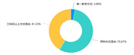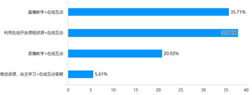 根据对教师授课形式的调查分析,教师选择利用在线开放课程资源+在线互动的教学形式占比最高,其次是直播讲解+在线互动。95%以上的教师在授课中能够采用多种教学方式结合的形式,教学手段较丰富。