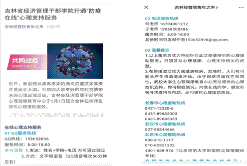 疫情爆发后,第一时间开通“防疫心理支持”线上服务,通过QQ、微信、电话等线上方式,及时为学生提供心理辅导、干预及心理援助,帮助学生理性认知疫情、客观对待疫情、正确防控疫情,最大限度地为学生减压释负,确保学生保持稳定和谐的良好情绪状态。