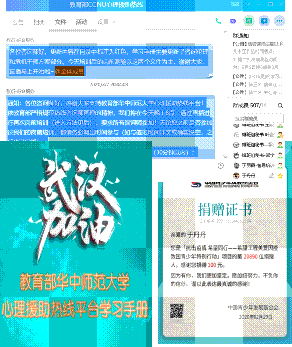 为响应国家教育部号召,加大对湖北及武汉地区疫情防控工作的支持力度,于老师报名参加“教育部——华中师范大学心理援助热线平台”的志愿者工作,排班值班,为疫区倾诉者提供心理热线服务,为驰援武汉贡献力量。疫情期间,向中国青少年发展基金会发起的“抗击疫情 希望同行——希望工程关爱因疫致困青少年特别行动”献出一份爱心。