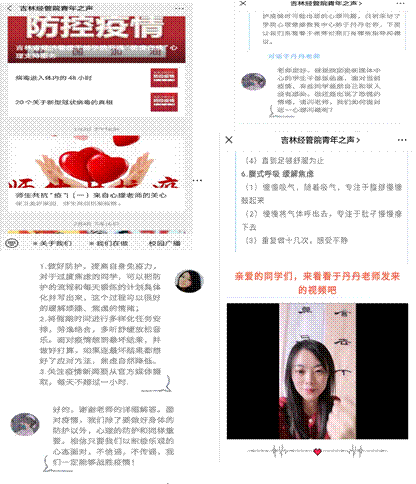 在疫情刚刚爆发不久,全国人民都为突如其来的疫情恐慌不知所措之时,考虑到我院学生在家隔离的心理状态,于老师针对于“疫情期间学生心理状态调试”等相关内容,回答了团委新媒体中心记者的采访,同时通过团委微信公众号平台推出心理支持推文,帮助学生及时调整心态,积极面对,做好心理防护,并录制短视频对学生鼓舞势气、增加信心。