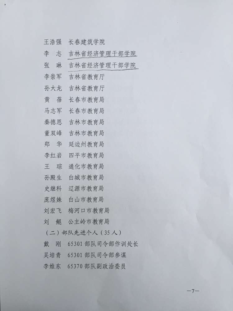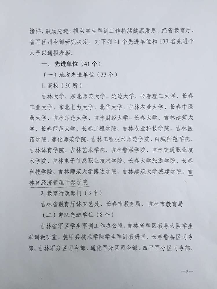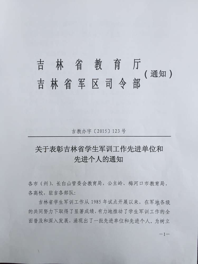 吉林省教育厅、吉林省军区司令部(吉教办【2015】123号)联合下发通知,关于表彰吉林省学生军训工作先进单位和先进个人。通知指出:“吉林省学生军训工作从1985年试点以来,在军地各级的共同努力下取得了显著成绩,有力地推动了学生军训工作的全面普及和深入发展,涌现出了一批先进单位和先进个人。为树立榜样,鼓励先进,推动学生军训工作持续健康发展,经省教育厅、省军区司令部研究决定,对41个先进单位和133名先进个人予以通报表彰。”我院被评为高校系统先进单位,学生工作处李志、公共教育学院张琳被评为先进个人。