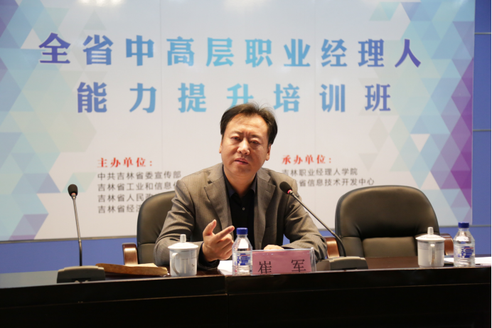 崔军院长在致辞中表示,本次培训班是为贯彻落实国家和省关于推动“大众创业、万众创新”的决策部署,站在全省角度,推动企业建立现代企业制度,提升创新创业能力,转变企业文化建设观念,发挥企业在吉林新一轮振兴发展中的主力军作用。从企业自身发展角度,推动企业提高创新发展能力,提升企业管理水平,促进企业加快转型升级步伐,围绕企业文化、品牌管理创新,鼓励和倡导企业建立起核心文化,增强企业文化的厚度,构建与时俱进、诚实守信、全员受益、互利互惠、合作共赢的企业文化。从企业家自身发展角度,提高企业家自身综合素质。通过培训,拓展企业家视野,立足长吉图,胸怀全世界,着眼东北亚,把握发展新机遇;提升企业家、职业经理人的精神境界,树立社会责任担当意识,自觉履行社会责任,维护职工合法权益,践行社会主义核心价值观。