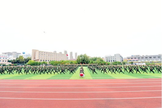 在雄壮的国歌声中,鲜艳的五星红旗冉冉升起,全体师生肃立,向国旗行注目礼,军训阅兵式由此拉开序幕。阅兵总指挥陪同孙杰光院长检阅各军训方队。伴着《分列式进行曲》的旋律,斗志昂扬的2018级新生们踏着整齐的步伐,喊着高昂的口号依次通过主席台接受检阅。随后进行的队列操、匕首术、军体拳展示,特别是动态倒计时的创意让人耳目一新,整齐划一的动作,高昂的士气赢得了现场热烈的掌声和欢呼声。由400名新生合唱的《强军战歌》将军训阅兵推向高潮。