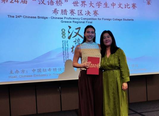 希腊克里特理工大学自2019年开设中文课以来第一次参加“汉语桥”中文比赛。经过层层选拔,KYRIAKI-LYDIA CHATZOPOULOU(李德华)同学成功晋级决赛。她凭借流利自然的中文演讲,准确无误的语言文化知识问答以及如行云流水般潇洒飘逸的太极表演,赢得现场观众热烈的掌声,并在激烈角逐中取得了非常优异的成绩,被中国驻希腊使馆选为观摩选手,代表希腊赛区出征全球总决赛。