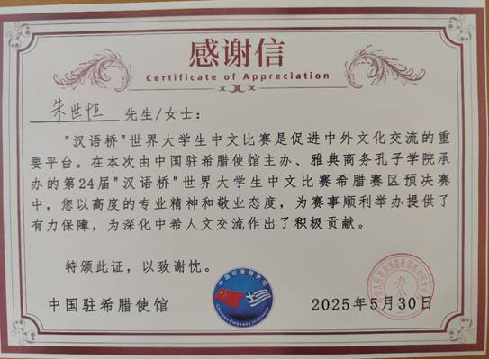 祝贺朱世恒老师在国际中文教育工作中取得的优异成绩!期待她在未来的教学工作中再创佳绩!在国际舞台讲好中国故事、传播中华文化,做中希友好的使者,继续为促进中希两国人文交流增辉添彩!