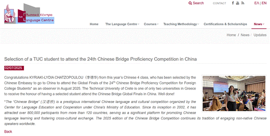 2025年7月2日,希腊克里特理工大学传来喜讯:我院国家公派出国教师朱世恒所指导的学生KYRIAKI-LYDIA CHATZOPOULOU(李德华)成功入选第24届“汉语桥”世界大学生中文比赛全球总决赛。她将作为希腊赛区两名代表之一,于2025年8月赴华参加这场全球瞩目的语言文化盛会。