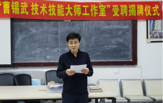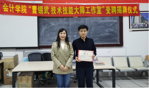 会议最后一项,会计学院林冬梅院长为技术技能大师曹锡武颁发聘书,并与曹所长一起为大师工作室揭牌。