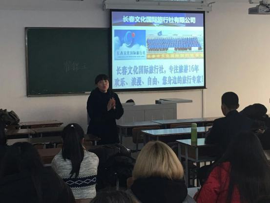 2016年11月23日下午3点,在高新校区307教室,应我院旅游管理教研室邀请,长春文化国际旅行社导游部崔锦玉经理,文化旅游学院11级旅游管理专业优秀毕业生任雪婷同学(专职出境领队)与16级旅游管理专业的同学欢聚一堂,畅谈旅游学子美好未来,旅游管理教研室全体教师参加。
