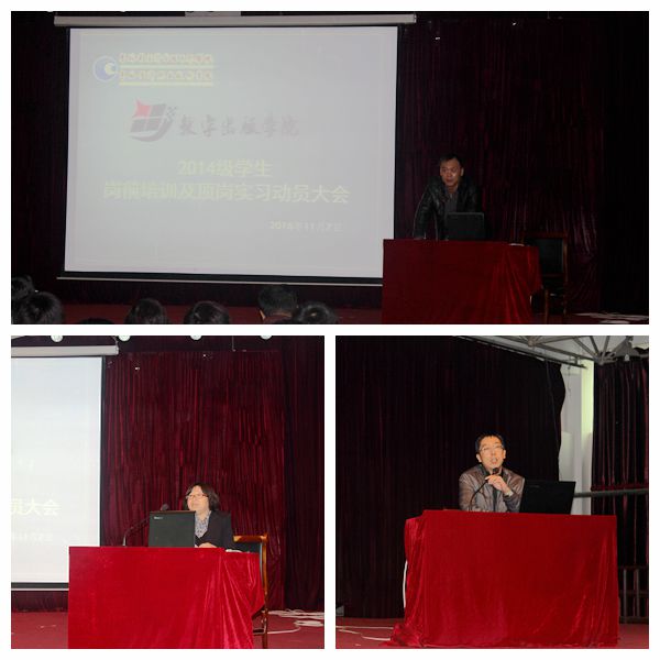 做好学生的顶岗实习工作是学院各项工作的重中之重。为更好的完善我院的顶岗实习,提高学生的就业质量,2016年11月7日下午13:00时,数字出版学院在前进校区6楼会议室召开了2014级学生岗前培训及顶岗实习动员大会。大会由数字出版学院副院长邓又明老师主持,数字出版学院院长刘庆红教授、党总支书记田小龙同志、辅导员沈波老师以及张海鸥老师出席了大会。