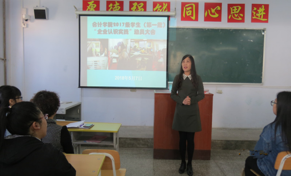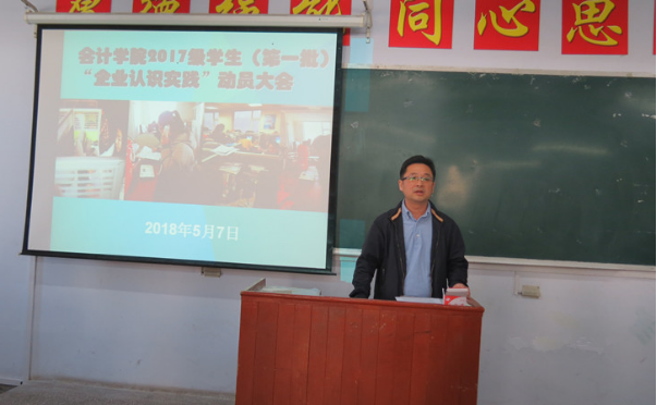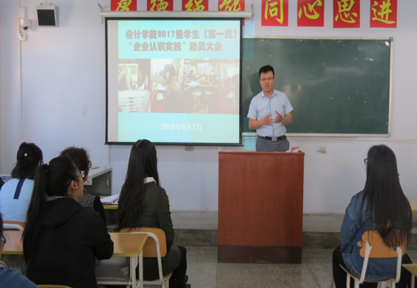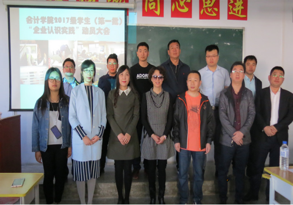 2018年5月7日上午,会计学院在院部A教学楼201教室召开了2017级学生(第一批)“企业认识实践”动员大会。参加本次大会的有:会计学院院长李昕、党总支书记田夫、副院长林冬梅、党总支副书记南洪吉、教学干事鲁秋玲、辅导员甘莹以及参加本批企业认识实践的2017级会计1、2班77名学生;参加本次大会的企业方代表有:畅捷通信息技术股份有限公司吉林办事处渠道经理袁强、程峰、李鹏飞,长春峰业科技公司的敖晓君经理,吉林省亁堃科技公司的穆大亮经理,吉林畅想科技公司的邢立龙,长春捷云网络公司的刘芮彤(是2017年“畅捷通”订单班学生,为会计学院2017届会计电算化专业毕业生)。