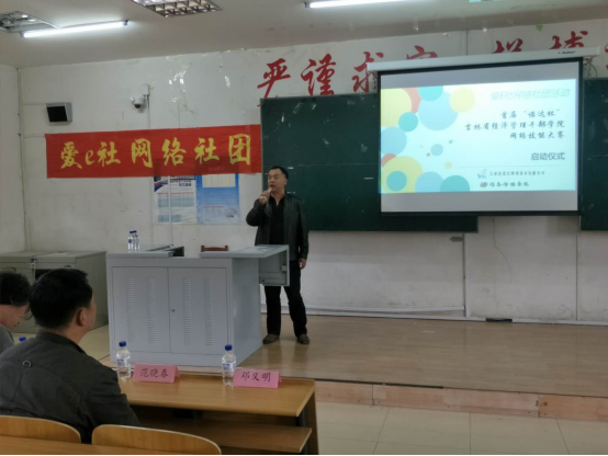 5月8日中午,技能大赛启动仪式在A教105多媒体教室隆重举行。参加启动仪式的有吉林省诺达网络技术有限公司总经理王英朕、诺达公司金牌讲师秦婷婷,信息传媒学院副院长邓又明、网络教研室主任范晓春、教育信息化中心果大军老师、网络技术教研室林鸿老师以及2016、2017级计算机应用技术专业全体学生,仪式由社团林鸿老师主持。启动仪式上,社团教练林鸿老师回顾了“爱E社网络社团”在过去的一年中取得的成绩,并介绍了社团今年将要举办的活动。