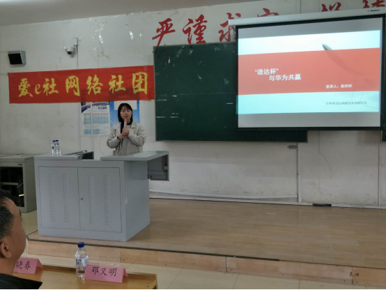 随后,吉林省诺达网络技术有限公司秦婷婷老师介绍了华为公司、华为认证体系和本次大赛的规程,鼓励学生们通过学习,让自己在工作之前就可以成为复合型人才,了解各个方向的技术,让自己在毕业生中脱颖而出。