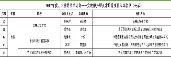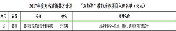 由齐海英老师负责申报的《旅游专业学生识岗、跟岗、顶岗实习方案设计》方案成功申报国家旅游局《2017年度万名旅游英才计划项目》中的“双师型”教师培养项目,该项目面向本科及高职院校旅游相关专业教师,在全国仅遴选资助100个教师,吉林省共有1个项目入选,我院是唯一入选的项目。