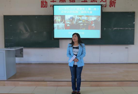 动员大会上,林冬梅副院长向第二批参加实践的同学阐明了《企业认识实践》这门课程开设的意义及与校内上课课程的本质区别,并将习近平总书记向广大青年提出的希望送给同学们,即要力行,知行合一,做实干家。不论学习还是工作,都要面向实际、深入实践,实践出真知。畅捷通北方大区业务总监邵家旭结合实例分别从角色转变、企业环境变化、人文环境变化、办公模式转变等方面来谈大学生参加企业实践的现实意义,他特别提到,信息化社会所需的会计人才是管理型的,会计核算已由电脑所代替,企业认识实践的舞台已由校企双方搭建,关键看学生自己如何去做。南洪吉副书记着重还是从学生外出实践的人身安全、出行安全、食品安全等方面对学生进行了安全教育。