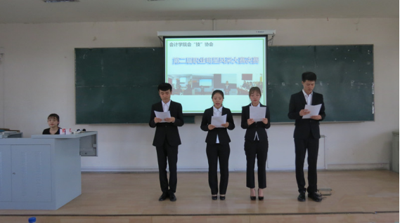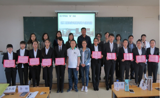 2018年5月9日下午,会计学院会“技”协会第二届职业明星风采大赛决赛在院部A教305圆满落下帷幕。本次大赛由会“技”协会会员刘宇婷、应文、刘娜、熊福财主持。会计学院院长李昕、党总支书记田夫、副院长林冬梅、党总支副书记南洪吉亲临本次大赛;担当本次大赛评委的为会“技”协会教练团的赵金燕、侯雁、梁雪、郭宇红、辛悦、张萌、刘骅7位老师,同时特邀了畅捷通信息技术股份有限公司吉林办事处的渠道经理袁强和万通药业集团长春分公司人力资源部杨部长担当面试问答环节主考官。