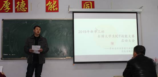 3月12日晚五点,信息传媒学院在总院A教207教室举办2019年“新华三杯”全国大学生ICT技能大赛(吉林赛区)赛事启动会。会议邀请了华三公司长春办事处代表、长春市云宝网络技术有限公司的领导和技术工程师为学生们介绍比赛事宜。信息传媒学院院长刘庆红、副院长邓又明、网络技术教研室全体教师出席了本次启动会。会议由网络技术教研室主任范晓春老师主持。