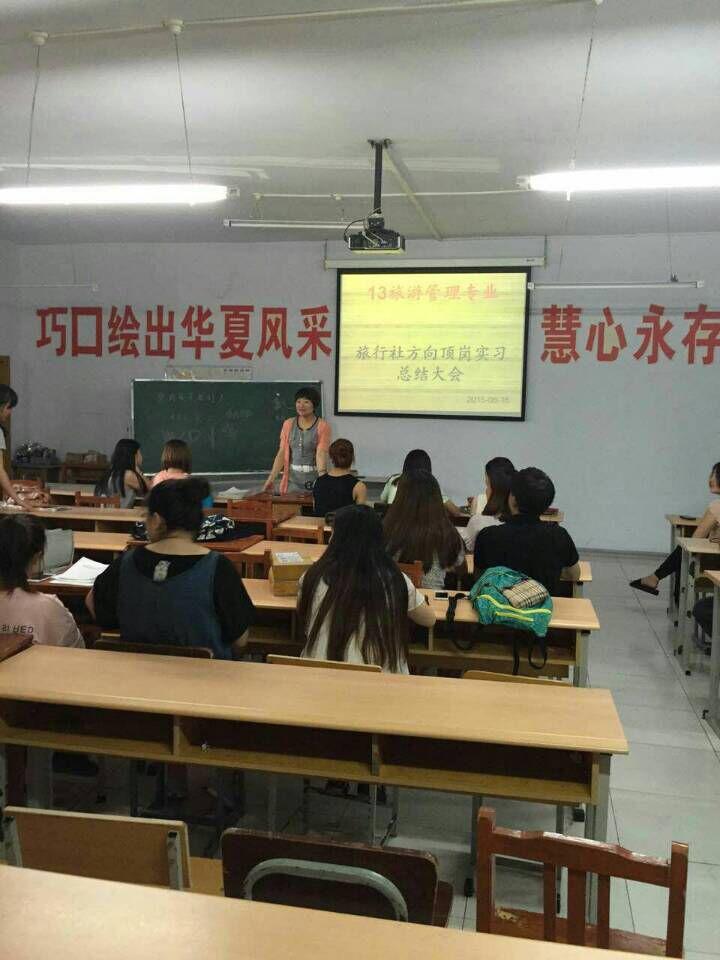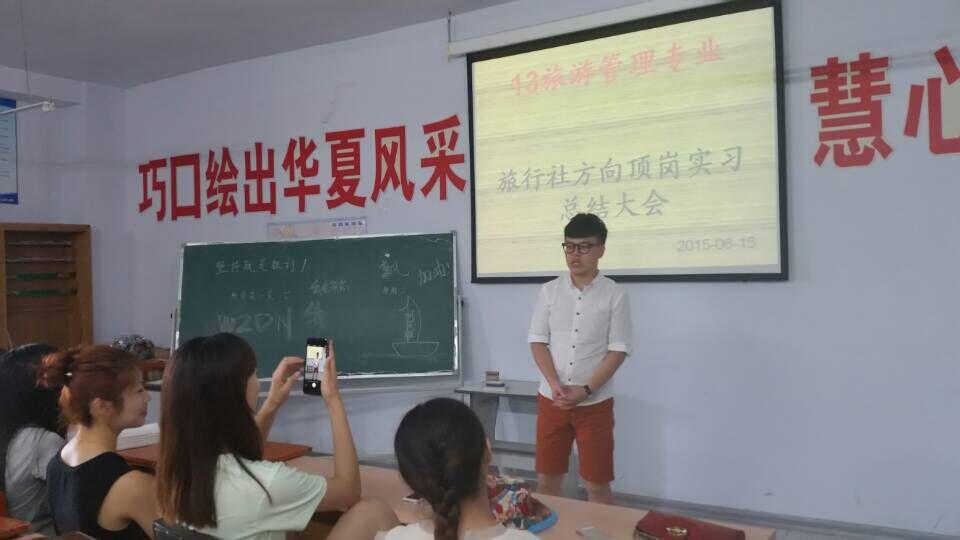 6月15日,文化旅游学院13级旅游管理专业的同学们完成了为期45天的旅行社方向的顶岗实习任务。虽然高新学生开始放假,但为了做好实习总结工作,上午8点,全体实习同学按时返校,同指导教师齐海英和辅导员老师王晓寰一起分享了45天实习的收获和成长。