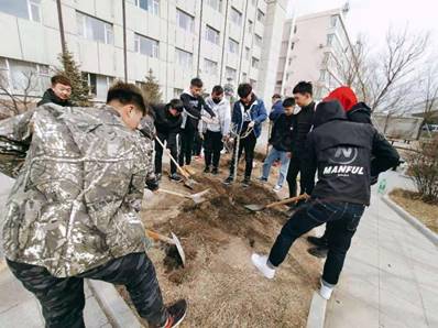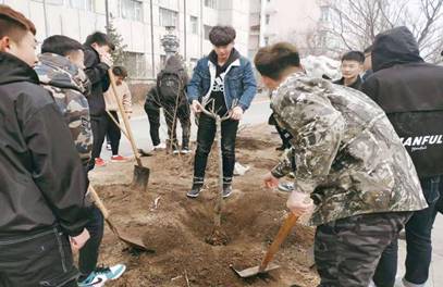 活动开始,同学们在刘庆老师的带领下分工协作,搬运材料、挖坑、栽树、盖土、浇水,每道工序都有条不紊的进行。对于大部分同学来说都是第一次种树,大家额头挂上了汗珠,身上沾满了尘土,但脸上洋溢着收获的喜悦。