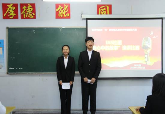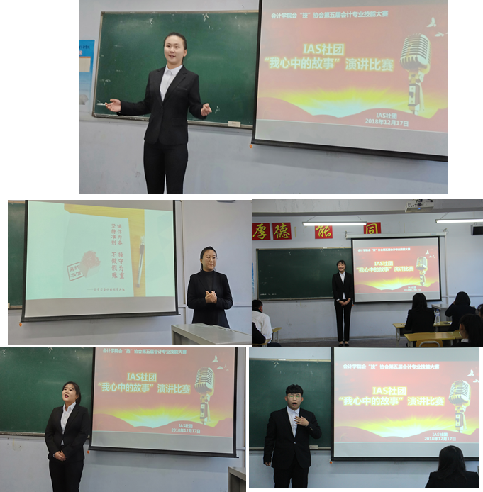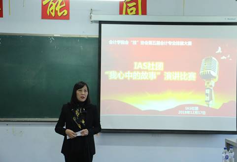 为了激发同学们的热情和激情,散发和传播正能量,12月17日中午12:00点,会计学院会“技”协会IAS社团在A教学楼207多媒体教室举行了“我心中的故事”演讲比赛,本次大赛由会“技”协会总教练、IAS社团教练林冬梅老师与社长牛可心全程组织策划,共有15名同学分别代表大一和大二各个班级参赛。本次比赛邀请了会计学院党总支书记田夫、院长盛立军、党总支副书记南洪吉、教研室主任张立伟、会计社团教练赵金燕、教学干事鲁秋玲、辅导员郝雷担任评委。由IAS社团的张庭瑞和邵雪两位同学主持。