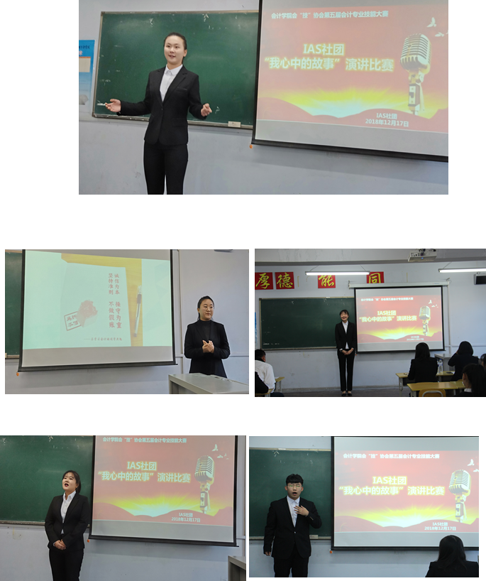 为了激发同学们的热情和激情,散发和传播正能量,12月17日中午12:00点,会计学院会“技”协会IAS社团在A教学楼207多媒体教室举行了“我心中的故事”演讲比赛,本次大赛由会“技”协会总教练、IAS社团教练林冬梅老师与社长牛可心全程组织策划,共有15名同学分别代表大一和大二各个班级参赛。本次比赛邀请了会计学院党总支书记田夫、院长盛立军、党总支副书记南洪吉、教研室主任张立伟、会计社团教练赵金燕、教学干事鲁秋玲、辅导员郝雷担任评委。由IAS社团的张庭瑞和邵雪两位同学主持。