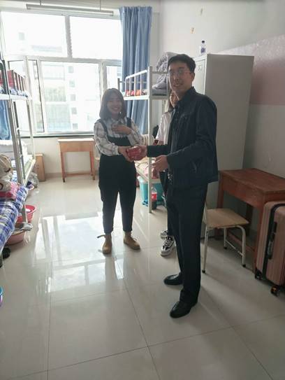 文化旅游学院一直秉承弘扬传统文化,用心关爱学生,用爱教导学生,用真情浇灌学生大学生活点点滴滴。在中秋佳节这样特殊的日子里,党总支书记田小龙、辅导员杨雪以及多名学生干部来到学校,为大一新生发放爱心月饼,将分院的关心送到每位新生手中。