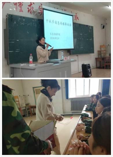联欢会伊始,周雪娟书记亲切地向同学们表达了节日的问候和关怀,赞扬了大家在军训中体现的坚忍不拔的精神和团结奋进的集体荣誉感,教导同学们要将军训的成果内化为精神向导,做有德行、有理想的青年人。周雪娟书记还强调走进大学之日时就是成人之日起,每逢佳节更要感恩父母,号召同学们联欢会后给亲人打电话祝福。迟涵老师将形式上的不与亲人过中秋节,引申到个人成长上的独立和坚韧,同时,与同学们联欢、与师长们共度也是一种团圆和欢聚。寄语过后,周雪娟书记为全体同学分发月饼,尤其还为回族同学准备了清真月饼。
