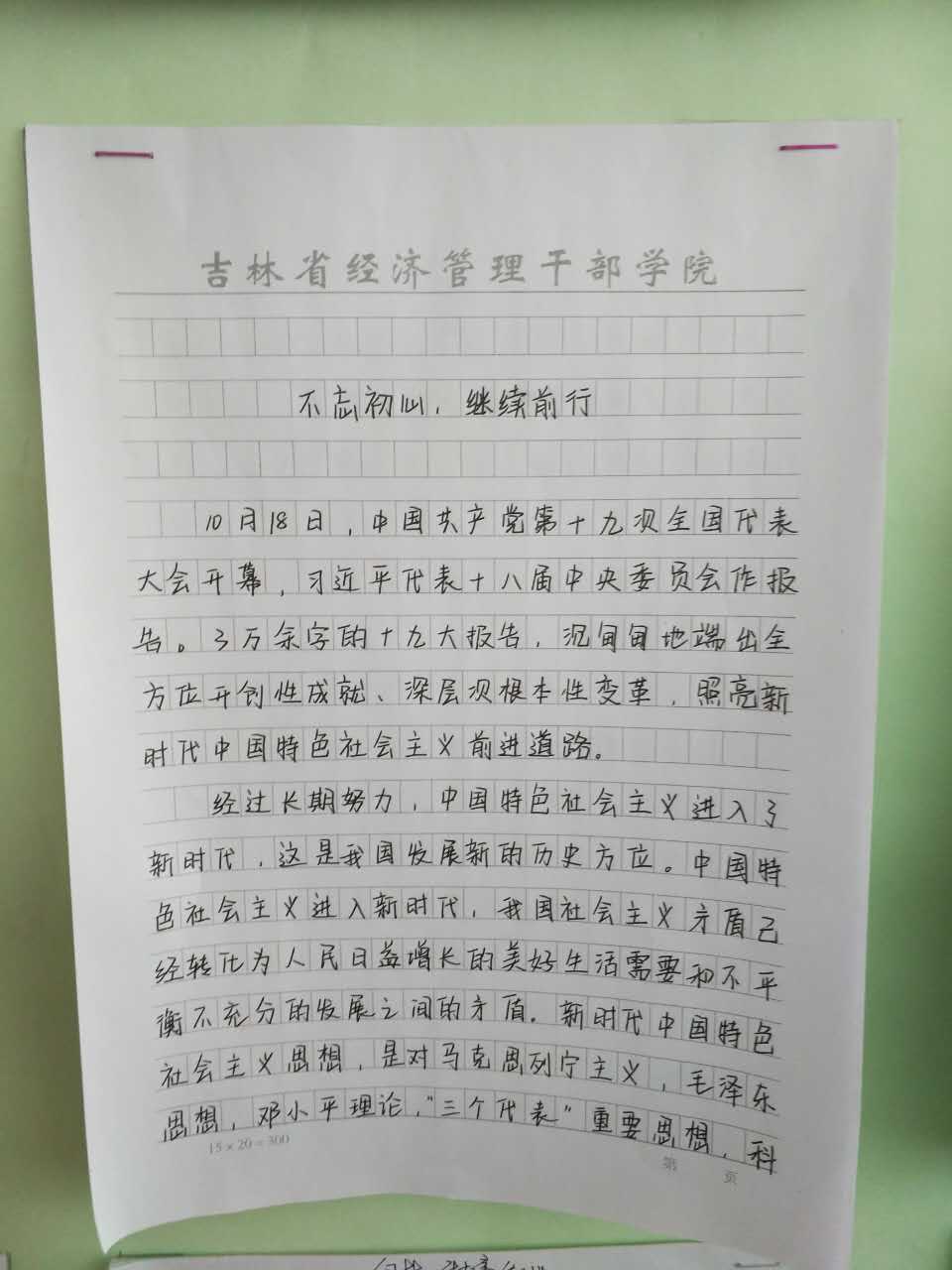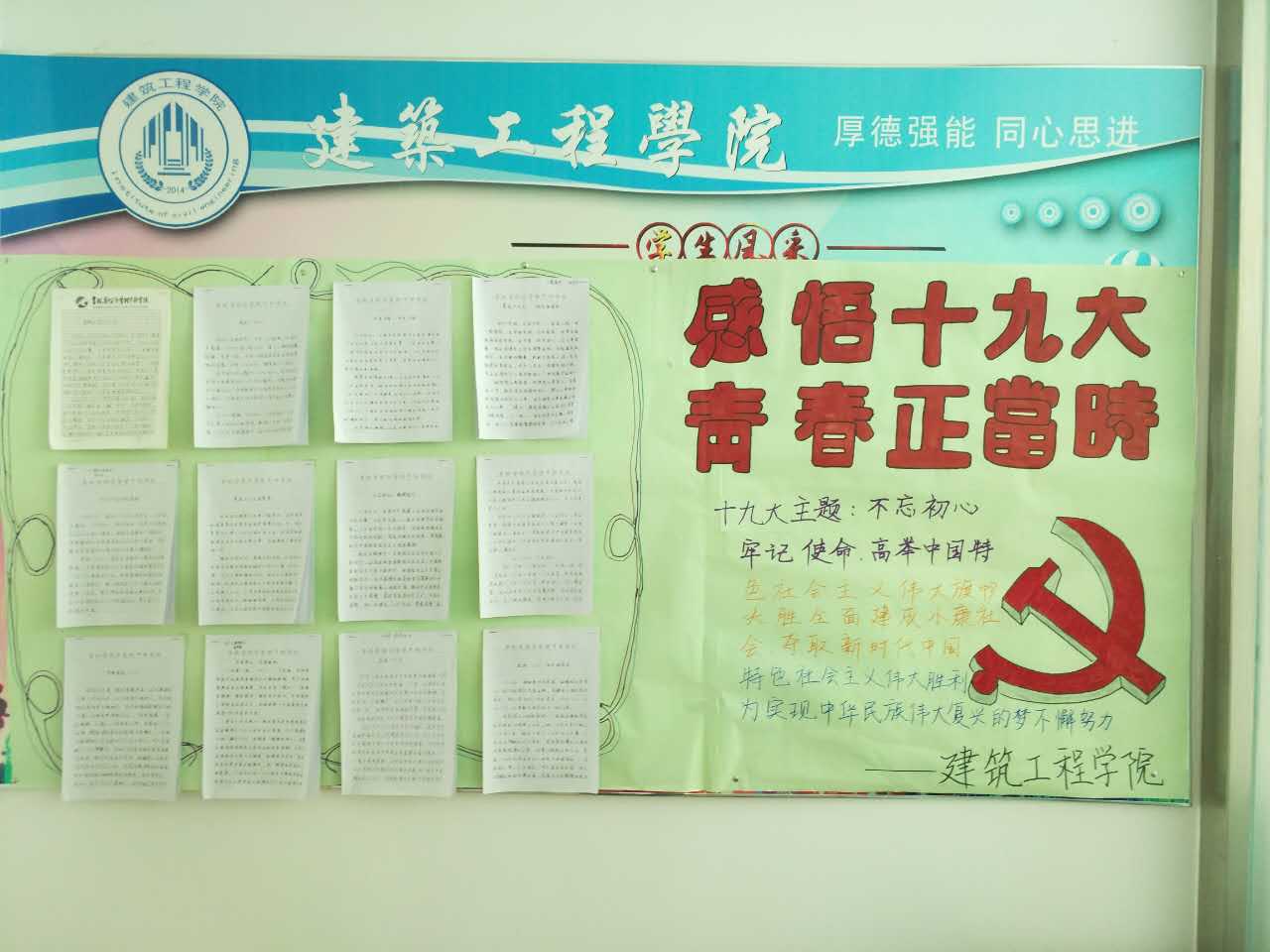 为了迎接党的十九大胜利召开,庆祝中国人民解放军建军90周年,同时为了更好的引导广大学生关注十九大,激发爱国热情,增强社会责任感和历史使命感,建筑工程学院组织于2017年10月23日开展“感悟十九大,青春正当时”主题征文活动。本次活动面向建筑工程学院全体学生,通过辅导员的层层筛选,选择出众者进行展览。