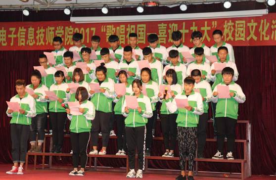电子信息技师学院于2017年10月25日下午在六楼报告厅举办了以“歌唱祖国 喜迎十九大”为主题的校园文化活动——大合唱比赛。在院领导和全体教师、学生的共同努力下,经过近一个月的精心策划和安排为迎接十九大的胜利召开奉上了一台精彩的大合唱比赛。