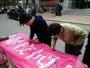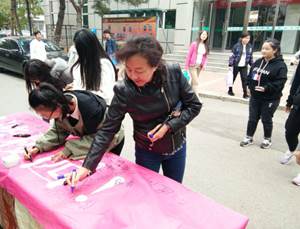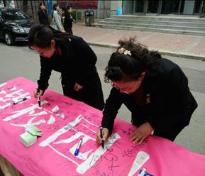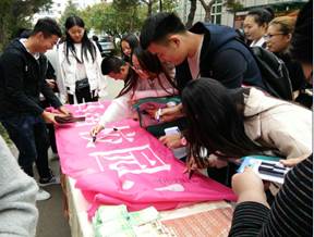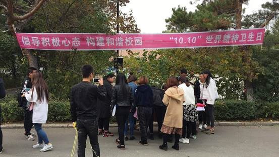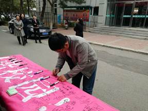 今年10.10精神卫生日“倡导积极心态 关注心理健康”的签名活动一开始就备受瞩目,在现场气氛的带动下,参加签名活动的学生越来越多,纷纷投入到签名活动中,让青春阳光的气息弥漫在校园里。尽管长春的天气十月初寒,但是寒冷的天气也没能阻止同学们参与活动的热情,活动持续了一个半小时,条幅上密密麻麻的布满了同学们的名字,同时也让学生们明确了心理健康的重要性及学习生活中要满怀“倡导积极心态 拥有快乐人生”的信念。同时此次签名活动也引得许多老师的关注与参与,路过活动现场的老师们也在条幅上签上自己的名字,表示对活动的支持与鼓励。