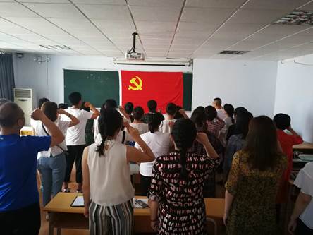 面对鲜红的党旗,公共教学部党支部书记刘建成同志带领全体党员,举起右拳,庄严宣誓。这是我们每个党员在入党时,立下的对党忠诚誓言,表明了自己为党的事业奋斗终身的决心和使命。庄严而肃穆的重温入党誓词活动,仿佛使每一位党员仿佛又回到那神圣的一刻,灵魂更加净化,信念更加坚定,信心更加增强,更加坚定了做让人民满意,让党放心合格共产党员的决心。