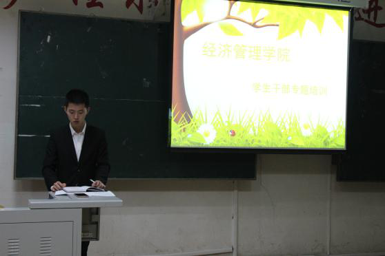 培训中,经济管理学院学生会主席许轩宁分享了他作为学生干部的成长经历,他希望学生会的成员在工作中可以态度端正、服从安排、公私分明、工作认真、以身作则,学生会成员应该起到模范带头作用。