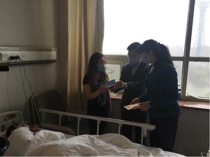 在得知朱亚萌同学患病的消息后,建筑工程学院积极地发起了“伸出爱的双手,共创生命奇迹”募捐活动。分院党政班子高度重视,从募捐活动的筹备策划,到募捐活动的开展,积极关注。认真组织辅导员带领学生会、团总支精心策划、组织实施。此次活动,更是得到了学院领导、学生工作处、团委、宣传部等部门的大力支持、关心和关注。同时也得到了全院广大师生的积极响应和大力支持,大家慷慨解囊、无私帮助;更让我们感动的是,曾经在建筑工程学院工作过的领导、辅导员老师,也都伸出了爱的双手,还有其他分院的部分师生也参与到了募捐活动中,献上了爱心。截至5月10日,共募集善款66594元人民币。2016年5月12日上午10:00学工处处长孙成雨、院团委老师叶嘉、建筑工程学院院长单旭 、副书记李萍、吕小丽、建筑工程学院团总支书记罗键宏、辅导员郭轩宁及学生会主席王明洋、生活部长李蕊、宣传部长张悦,一同来到吉林大学第一附属医院探望朱亚萌同学。