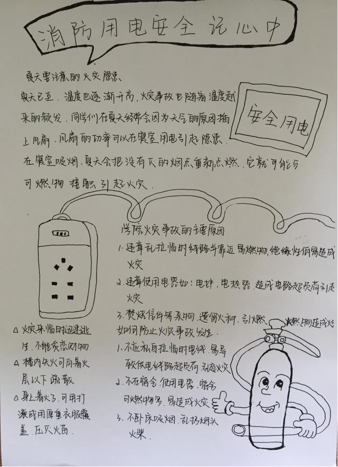 讲座前,为大家发放了防火用电安全知识手抄报,让大家对防火用电安全有一定的了解。主讲人是王国峰同学。他向同学们展示了多种违章用电造成火灾的案例,以此警示同学们,用电安全不容小觑;又说明了插排品质及放置位置是否合适的问题,提示同学们拒绝购买三无插排,不要把插排放置在有易燃物的周围,插排一定要固定,有效避免发生火灾;又指出来大家多种危险的使用电器的习惯,如超负荷用电,湿手触摸正在通电的电器;还为大家普及了各种灭火器的使用方法及使用范围;最后为大家讲解了各种安全警示标识。