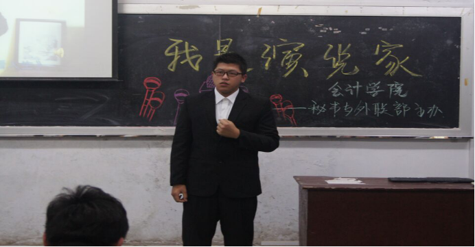 为了培养同学们的逻辑思维能力,增强同学们的创新能力和思考能力,加强相互间的思想交流。 12月 9日,会计学院学生会外联部组织15级部分学生,在和平校区教学楼317室,举行一场《我是演说家》活动,现场活动气氛活跃,活动圆满成功。