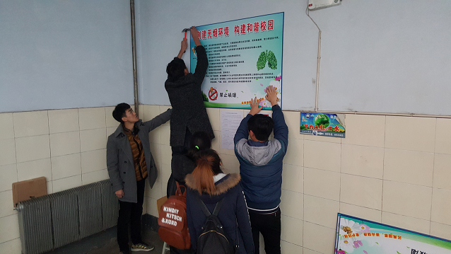 为培育和践行社会主义核心价值观,大力弘扬“奉献、友爱、互助、进步”的志愿者精神,美化校区环境,为同学营造良好的生活学习氛围。文化旅游学院校企合作单位——长春递法明文化传播有限公司为和平校区制作了100块励志宣传板。文化旅游学院“飞扬志愿者协会”的同学从11月29日起,利用一周的午休时间,为和平校区的教学楼走廊、教室内,张贴励志名言、禁烟宣传海报,为和平校区师生创造了温馨、和谐的学习环境献出了自己的一份力。