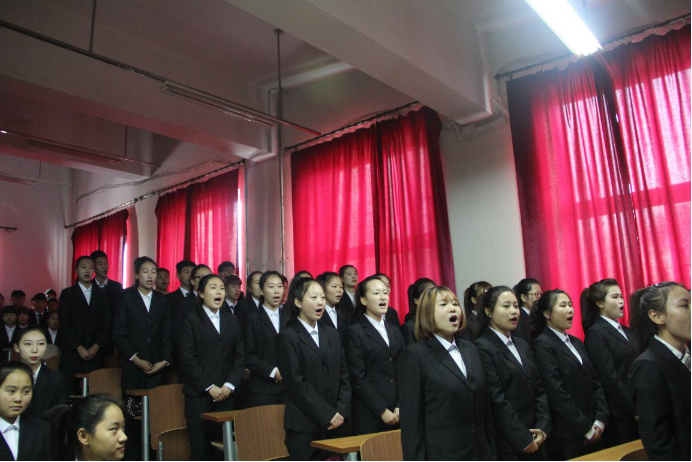 获得比赛一等奖的2015级旅游管理班学生在演唱《黄河大合唱》