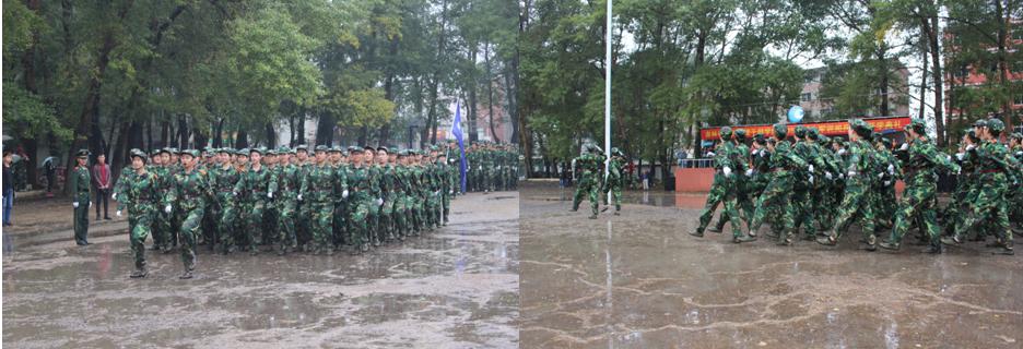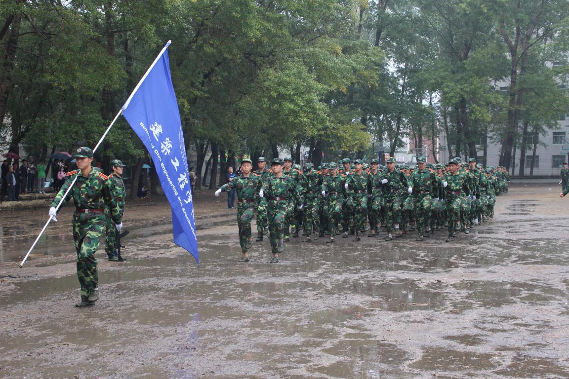 伴着庄严的升旗仪式,大会正式拉开序幕。经过紧张而艰苦的训练,如今建筑工程学院新生同学们已经做好受检的准备。而正当分列式开始时,突然天降大雨。在滂沱的大雨中,新生们的军装很快就湿透了,然而恶劣的环境并没有击退他们的士气,沸腾的血液与寒冷的秋风抗争,他们反而以更加饱满的精神在大雨中行进。整齐而坚定的步伐,在操场上起阵阵水花,嘹亮的口号响彻阅兵场,新生们昂扬的斗志和蓬勃向上的精神赢得了全场阵阵掌声。