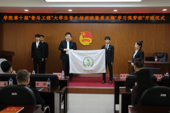 开班仪式上,班主任郑明月老师宣读了培养方案,党委副书记单魁贤为本期学习筑梦班授旗,随后全体学员在班旗下宣誓。